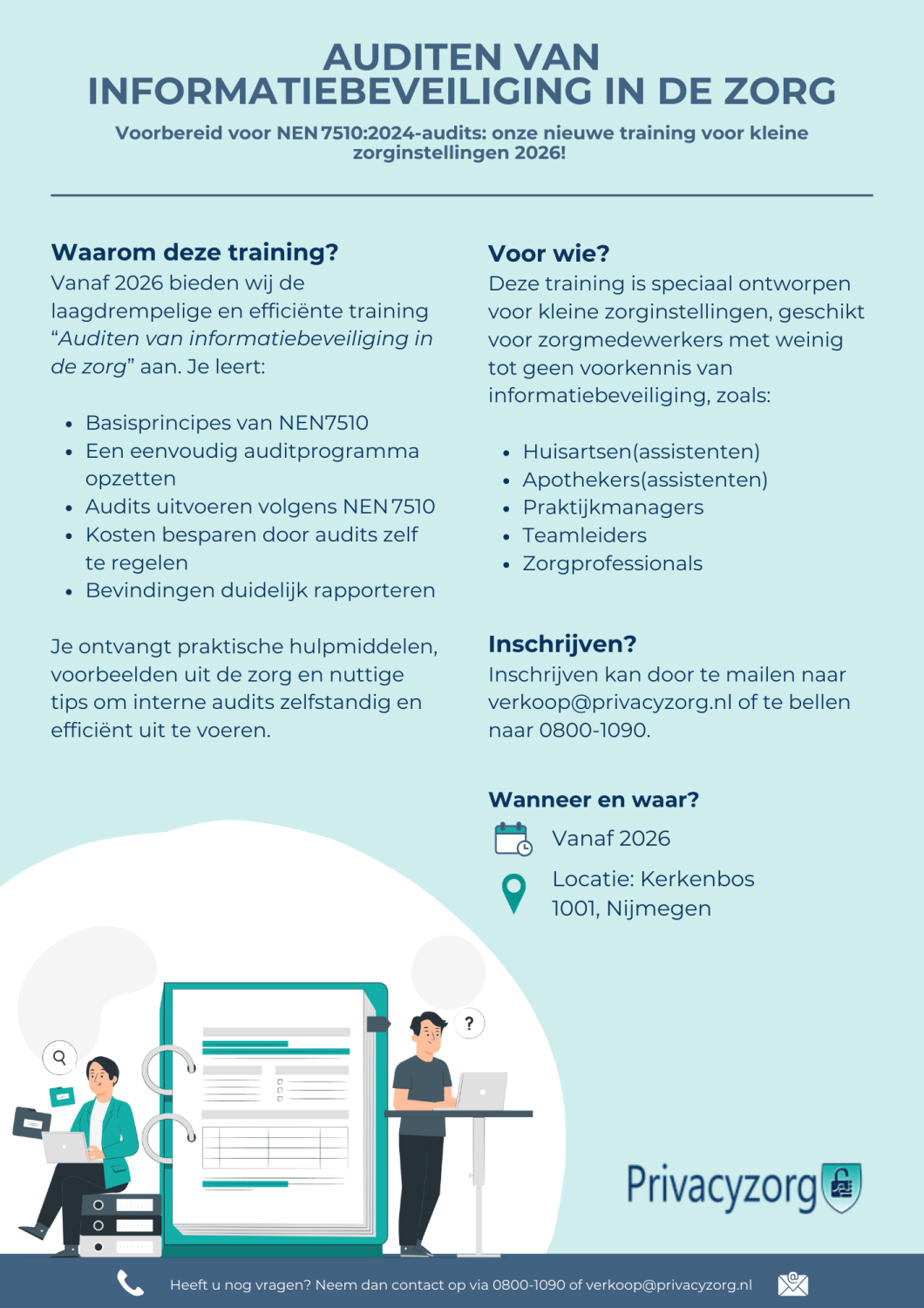 Vanaf 2026 bieden wij de laagdrempelige en efficiënte training “Auditen van informatiebeveiliging in de zorg” aan. Je leert: