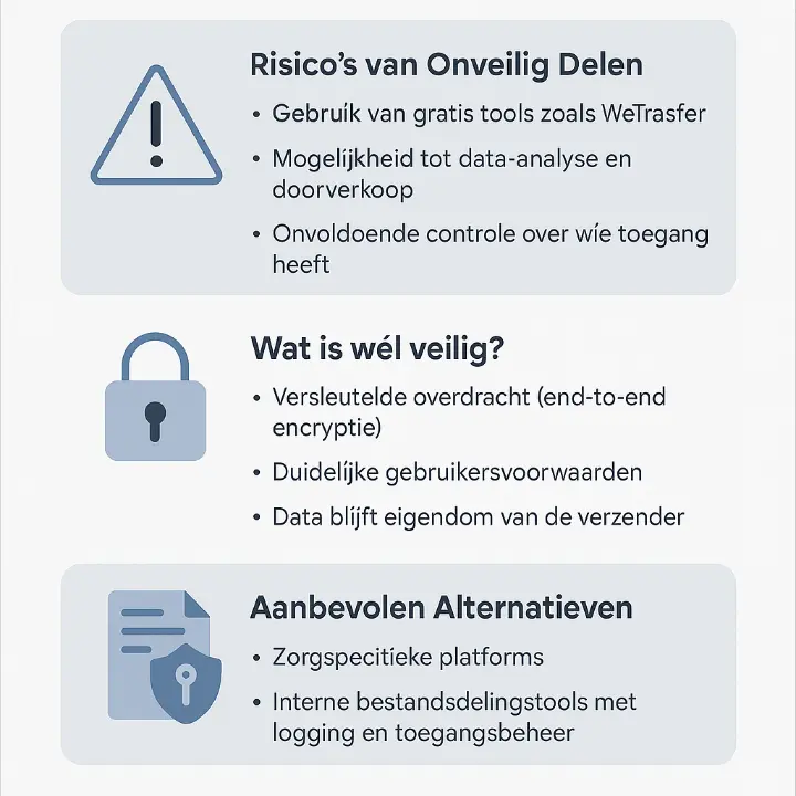 Als zorgorganisatie werk je dagelijks met vertrouwelijke gegevens van cliënten en medewerkers. Het gebruik van tools zoals WeTransfer zonder duidelijke afspraken over datagebruik kan leiden tot risico’s op het gebied van privacy en compliance.